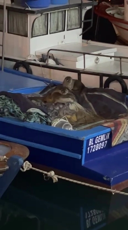 Gece saatlerinde limanda bulunan vatandaşlar, bir teknenin üzerinde hareketlilik fark etti. Yakından bakıldığında ise aç kaldıkları düşünülen anne su samuru ile yavrularının tekneye çıktığı görüldü. Bir süre tekne üzerinde dolaşan sevimli misafirler, limanda bulunanların ilgisini çekti.