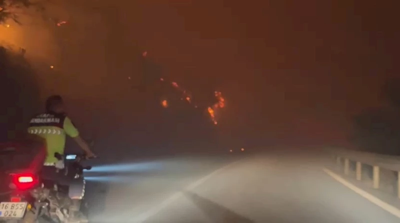 Bursa’nın Gürsu ilçesinde çıkan orman yangını için ekipler seferber oldu. Alevlerin arasında kalan basın mensupları ve jandarma görevlileri, yangının tam ortasında mahsur kaldı. Jandarma öncülüğünde alevlerin arasından güçlükle çıkıldı. O anlar saniye saniye kameralara yansıdı.