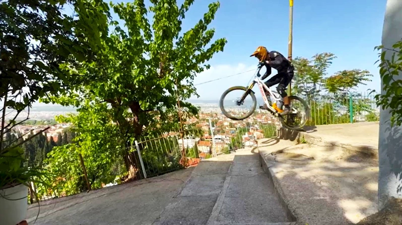 Bursa’da nefes kesen bir ilk...Dik merdivenlerden korkusuzca bisikletle iniyorlar