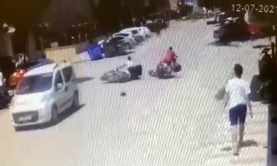 Bursa'nın İnegöl ilçesinde meydana gelen kazada 2 motosiklet çarpıştı, 1 kişi yaralandı. Kaza anı bir işyeri güvenlik kameralarına saniye saniye yansıdı.