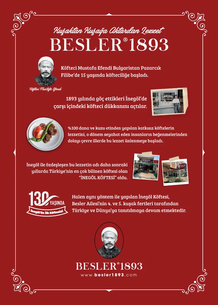 Köfteci Mustafa Efendi, Bulgaristan Pazarcık Filibe’de 15 yaşında köfteciliğe başladı. 1893 yılında göç ettikleri İnegöl’de kardeşi Ahmet Efendi ile şu anda da devam etmekte olan çarşı içindeki köfteci dükkanını açtılar. %100 dana ve kuzu etinden yapılan katkısız köfteler, kısa zaman içinde çevre illerde ünlenmeye başladı. İnegöl ile özdeşleşen bu lezzetin adı daha sonraki yıllarda Türkiye’nin en çok bilinen köftesi olan ‘İNEGÖL KÖFTESİ’ oldu. 1940 yılında 2. Kuşak İbrahim BESLER ve kardeşi Mehmet BESLER , Bursa’da Ahmet Vefik Paşa tiyatrosunun aralığında bir şube daha açtılar. Halen aynı yöntem ile yapılan gelenekselleşmiş İnegöl Köftesi, Besler Ailesi’den 4. kuşak Mesut Besler ve 5. kuşak İbrahim Melih BESLER tarafından Türkiye’ye ve Dünya’ya tanıtılmaya devam etmektedir.