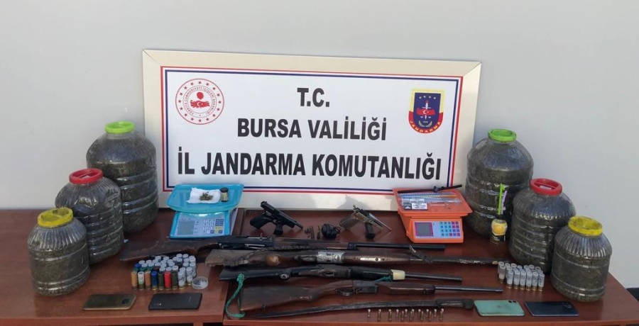 Şüphelilerin ikametlerinde yapılan aramalarda ise samanların altına gizlenen, 6 adet farklı ebatlarda plastik bidon İçerisinde toplamda 900 gram esrar, 10 gram peçeteye sarılı kubar esrar, 3 adet uyuşturucu kullanım aparatı, 2 adet hassas terazi, 7 adet uyuşturucu kullanım pipeti, 1 adet Blow Magnum marka tabanca, 1 adet parçalara ayrılmış tabanca, tabancalara ait 2 adet şarjör, 17 adet 9 milimetre tabanca fişeği, 4 adet ruhsatsız 12 kalibre av tüfeği, 59 adet 12 kalibre tüfek kartuşu ele geçirildi.