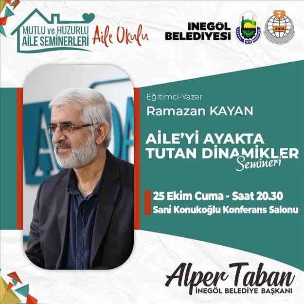 “Aile Okulu” eğitimlerinin 2’nci haftasında Cuma akşamı Eğitimci Yazar Ramazan Kayan “Aileyi Ayakta Tutan Dinamikler” seminerinde İnegöllülerle buluşacak