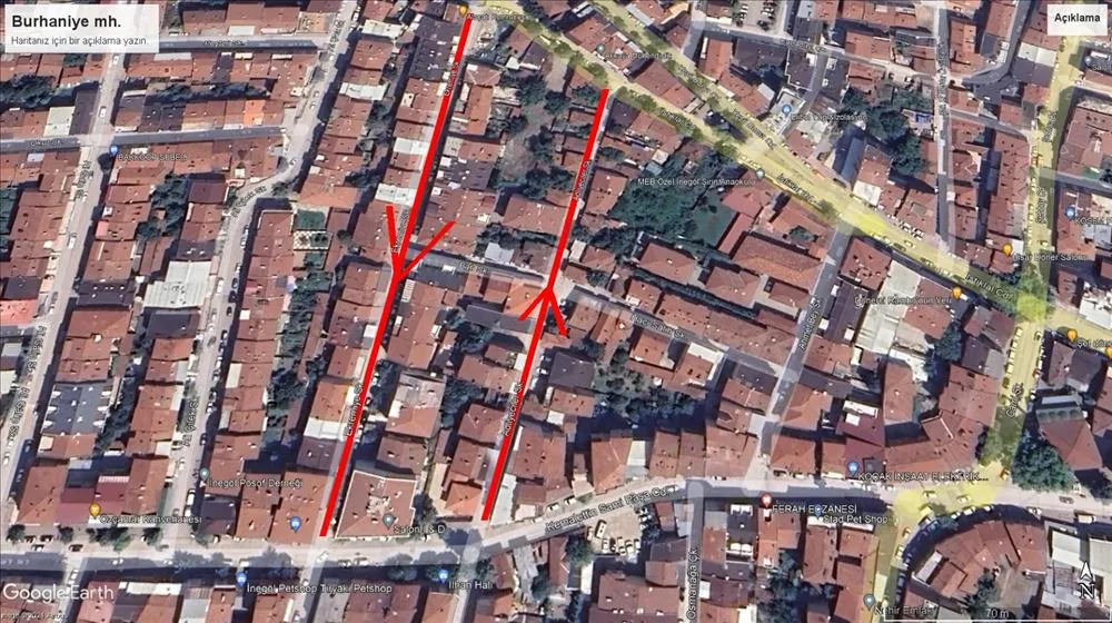 İnegöl Belediyesi’nin talebi üzerine UKOME kararıyla Burhaniye Mahallesi Adliyeciler Sokak ile Ekremiye Sokakta tek yön uygulaması başladı