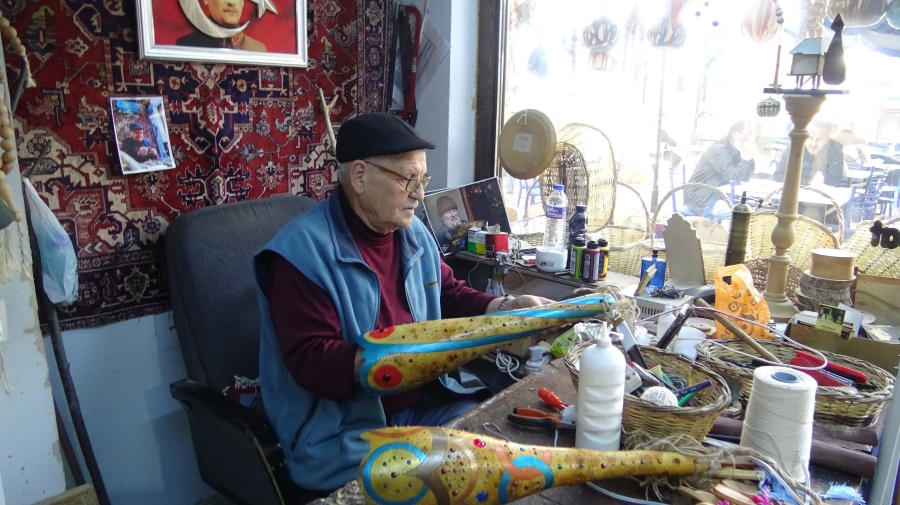 1958 yılında ağaç tornacısının yanında çırak olarak mesleğe başladığını anlatan Bedri Karalar, “Bursa’da 20 senedir kabak sanatıyla uğraşıyorum. Bursa’da ilklerdenim. Bir çok talebemiz oldu, yetiştirdik. Şu an Tahtakale içerisinde susak kabağı ve hediyelik eşyayla uğraşıyoruz. Yapmış olduğumuz susak kabağındaki avizelerimiz Türkiye’nin her yerine gidiyor. Yaptığımız işin gelirine bakılırsa ekonomik olarak pek bir gelir elde edemiyoruz. Sadece hobi olarak bu işi sevdiğimiz için yapıyoruz. Bir ev geçindirmeye kalkarsak bunlarla mümkün değil. Şu ân zaten fiyatların çok yükselmesinden dolayı bir ham kabağın 45-50 lira olduğu söyleniyor. Yani bunu devam ettirmemiz mümkün değil. Eşimiz dostumuz gelsin çayımızı, kahvemizi içelim. Yaşım 76, yapacağımız çok bir şey kalmadı. Göz ameliyatı olduk, şu anda kabak sanatıyla uğraşamıyoruz. İş yerinde oturup gelen eşi dostu bekliyoruz. Buradaki gelirler ile çocukları okula göndermeye kalksak yapamazdık. Çünkü Türkiye’de sanata değer yok. İnsanlarımızın ekonomik sıkıntıları olduğu için sadece zaruri ihtiyaçlarını karşılıyorlar” diye konuştu.